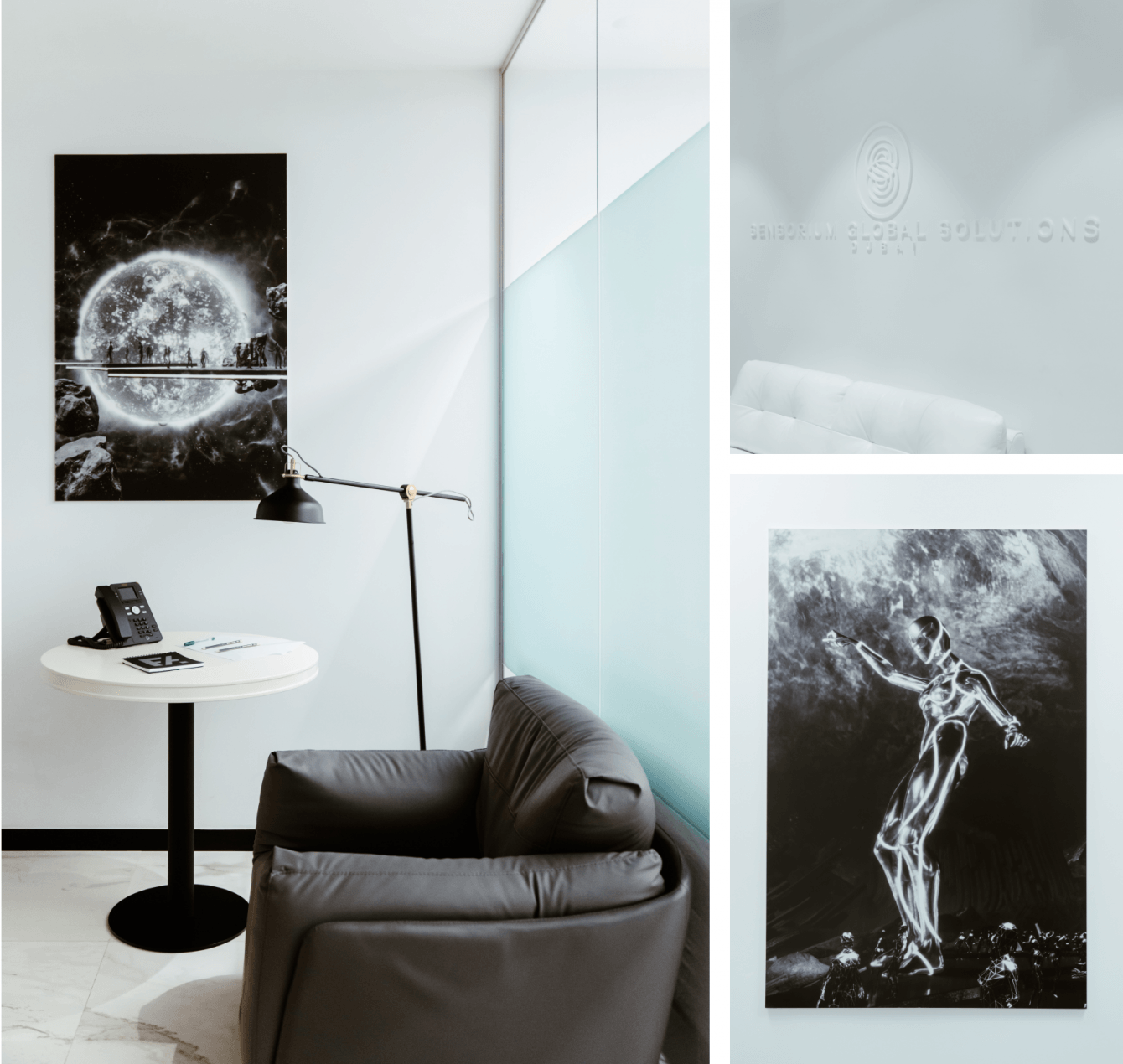 Первоначальный вид помещения шел вразрез с имиджем Sensorium и его цифровой эстетикой. Стойка ресепшн и мебель не сочетались друг с другом, деревянные текстуры упрощали стиль офиса. Мы внедрили элементы технологичного минимализма и разбавили их деконструктивизмом Захи Хадид — автора дизайн-проекта здания, где находится Sensorium. Это позволило интегрировать помещение в общую стилистику и сделать пространство более приятным глазу.