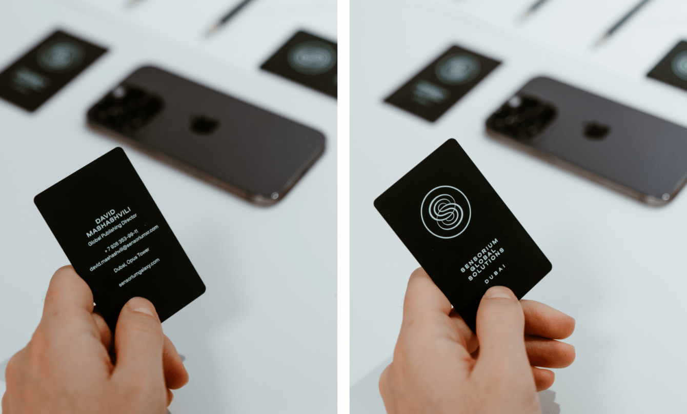 Второй задачей стала разработка NFC-визиток — инновационных карточек, соответствующих технологичному бэкграунду нашего клиента. Мы сверстали лендинги на основе брендбука Sensorium и выкупили отдельный домен для сайта — sensoriumgalaxy.site. На домене разработали для 15-ти сотрудников компании страницы со всей контактной информацией. Создали лаконичные визитки, которые превратили обмен контактами в одно прикосновение: достаточно приложить карточку к любому гаджету, чтобы открыть страницу со ссылками на социальные сети, телефонами и другими контактными данными сотрудников.