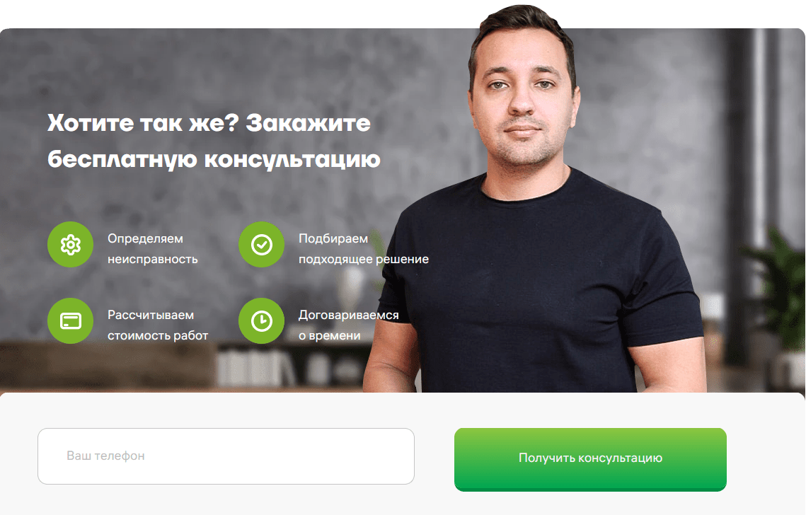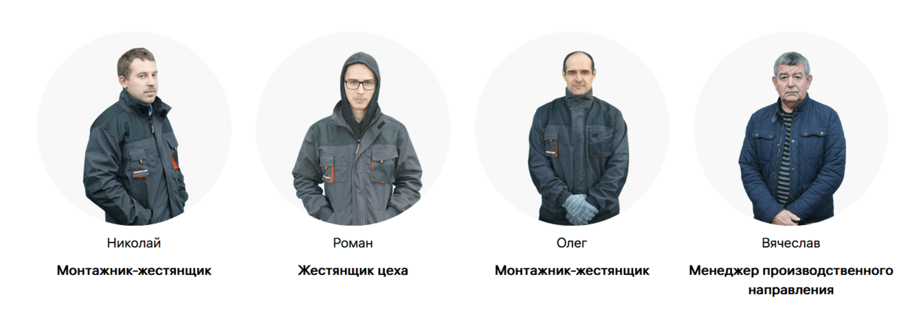 Часто на подобных сайтах размещают идеальные фотографии качков в комбинезонах. Вместо этого мы разместили честные фото сотрудников — это вызывает больше доверия