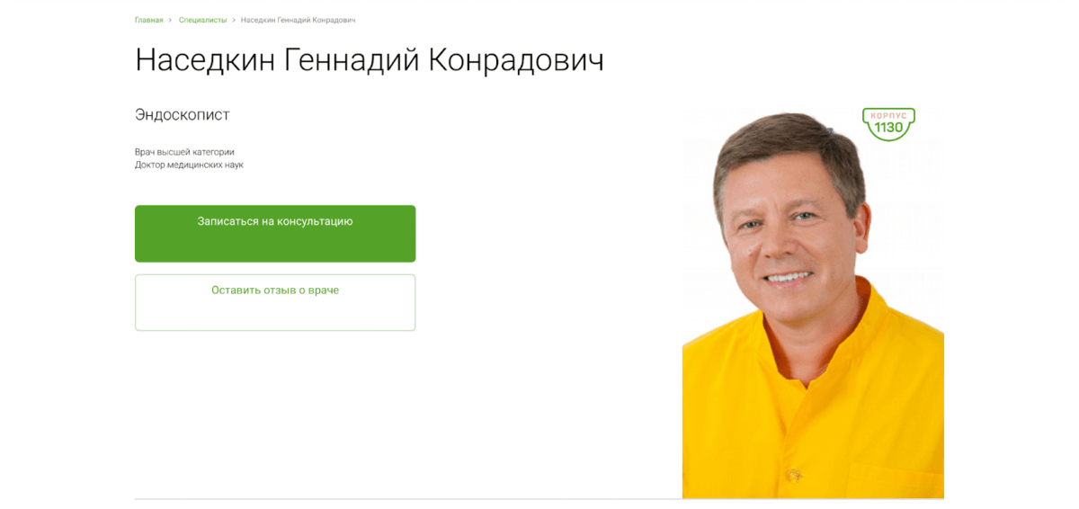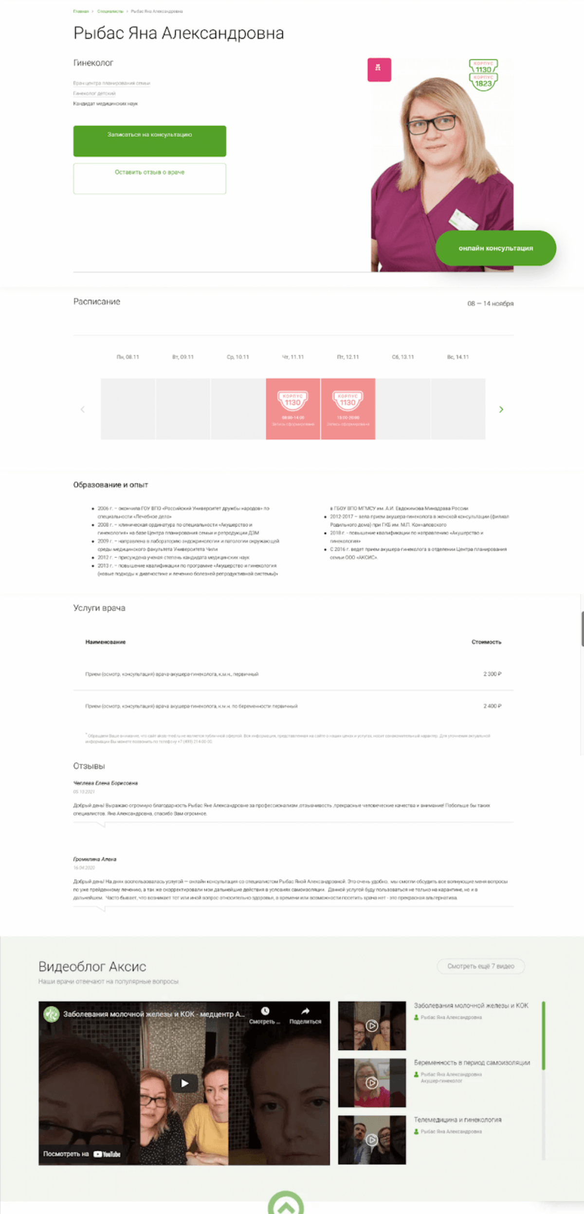 Каждая страница врача стала полноценной посадочной, где есть сертификаты, видео, тексты об опыте и оказываемых услугах, расписание для записи, отзывы и другие блоки.