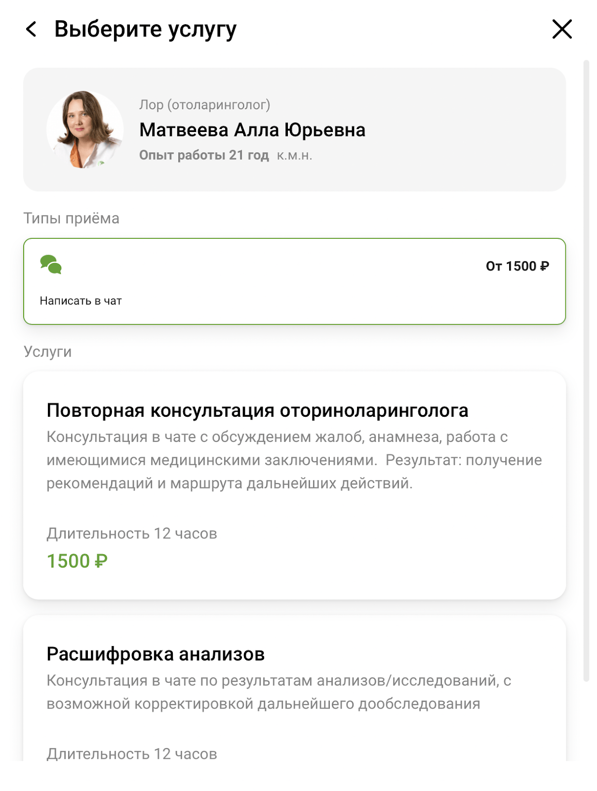 Сразу видна стоимость услуг и кнопка с записью к врачу: