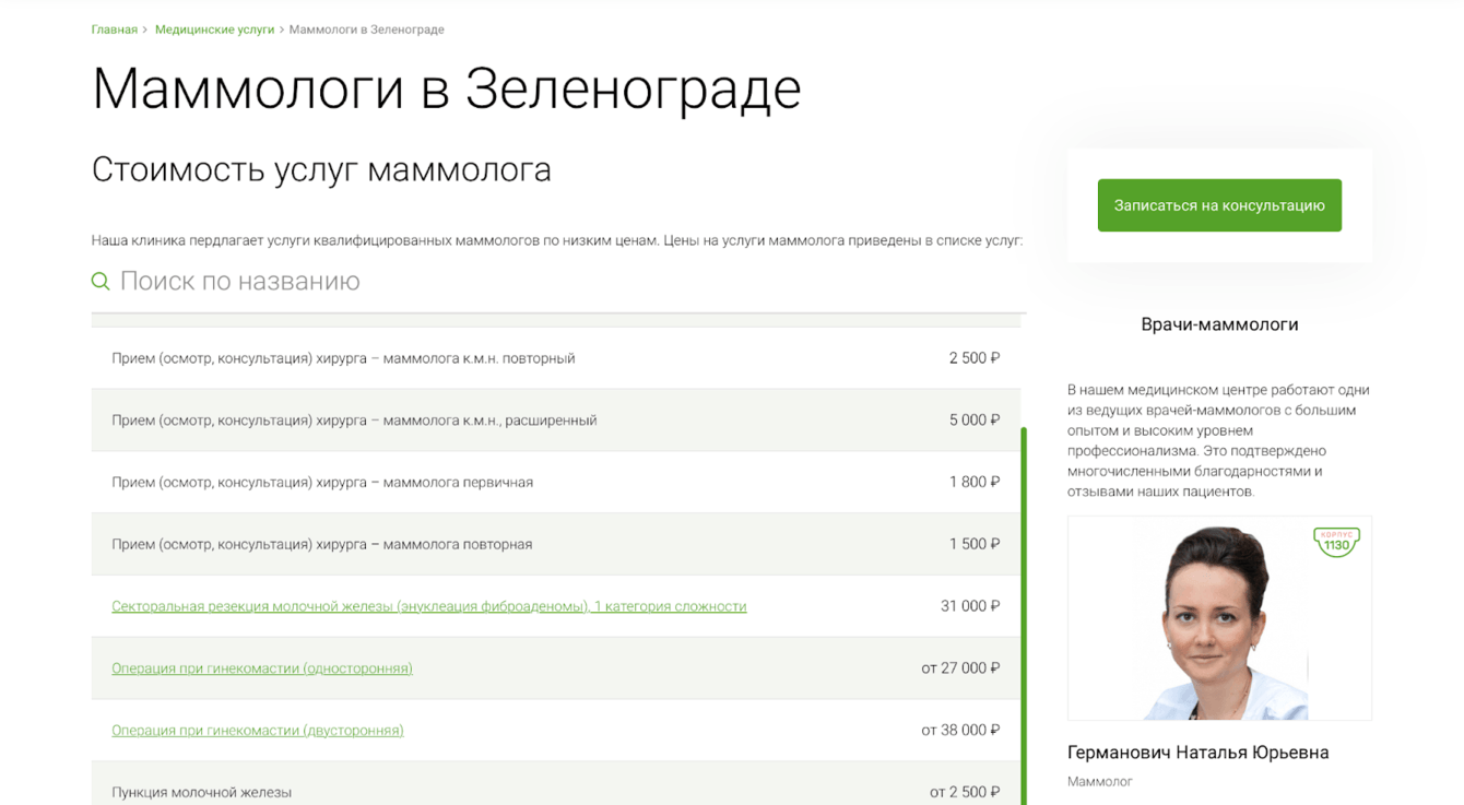На детальные страницы врачей добавили список услуг, которые оказывает конкретный специалист. Так посетитель сразу видит стоимость первичного и повторного приема. Нецелевая аудитория уходит, не нагружая администрацию медцентра звонками.