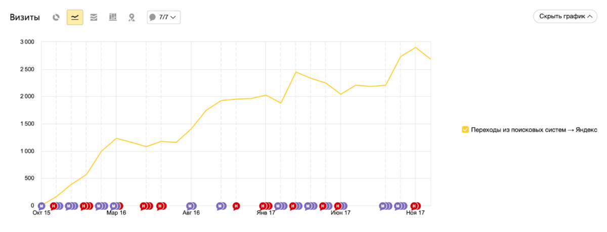 Благодаря работам, которые мы выполнили за полгода, объем переходов из поисковых систем планомерно рос на протяжении четырех лет.