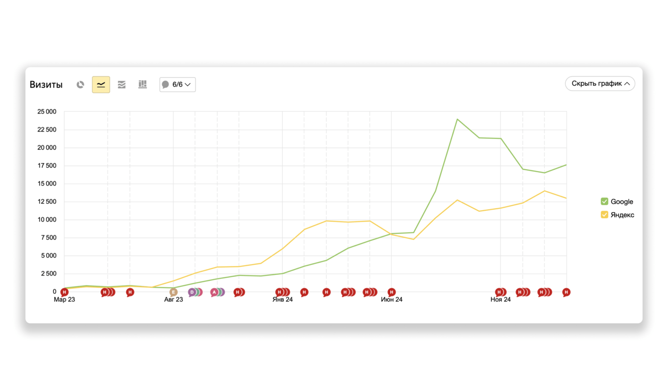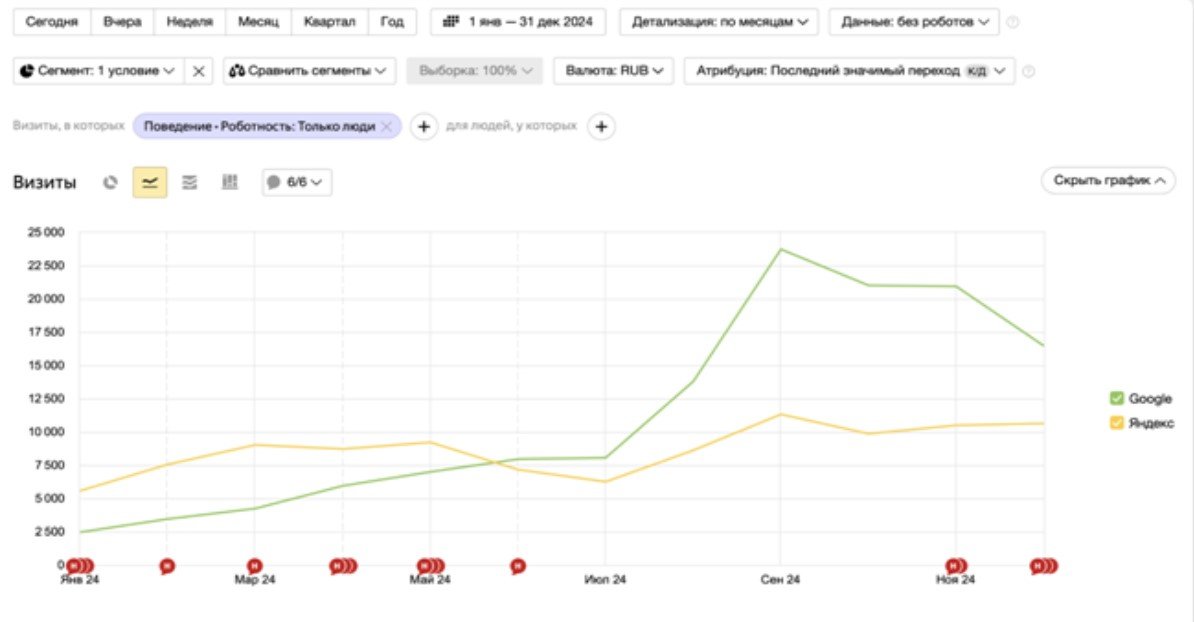 На февраль 2025 года цифра стабилизировалась. Клиент получил около 28 тысяч визитов из обоих поисковых систем. На пике трафик доходил до почти 35 тысяч визитов в месяц.