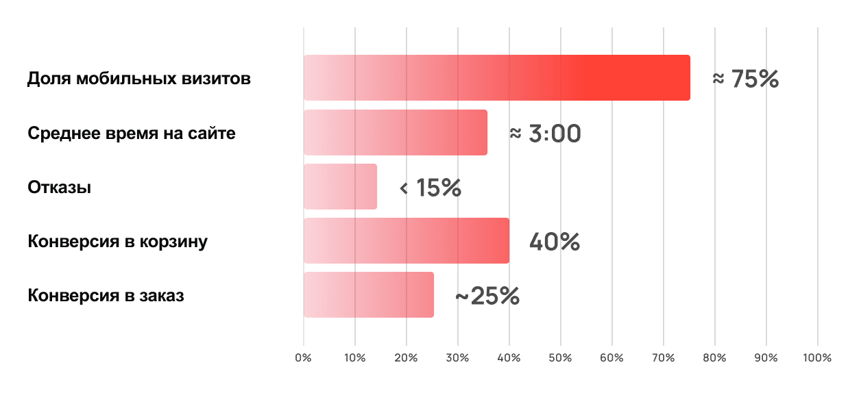 Результат: доля мобильных пользователей выросла до 75% при сохранении нормальных поведенческих показателей (время ~3 мин., отказы 40%, в покупку ~25%.
