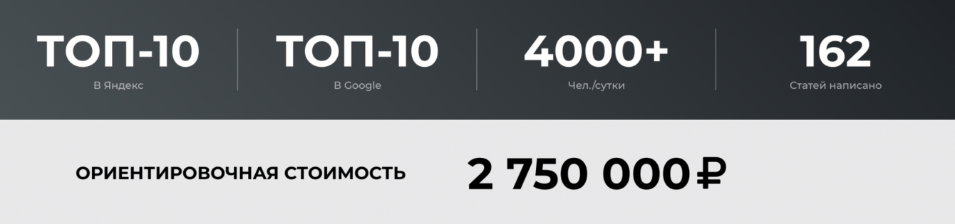 — Сайт вышел в ТОП-10 Яндекса и Google по большинству запросов семантического ядра.