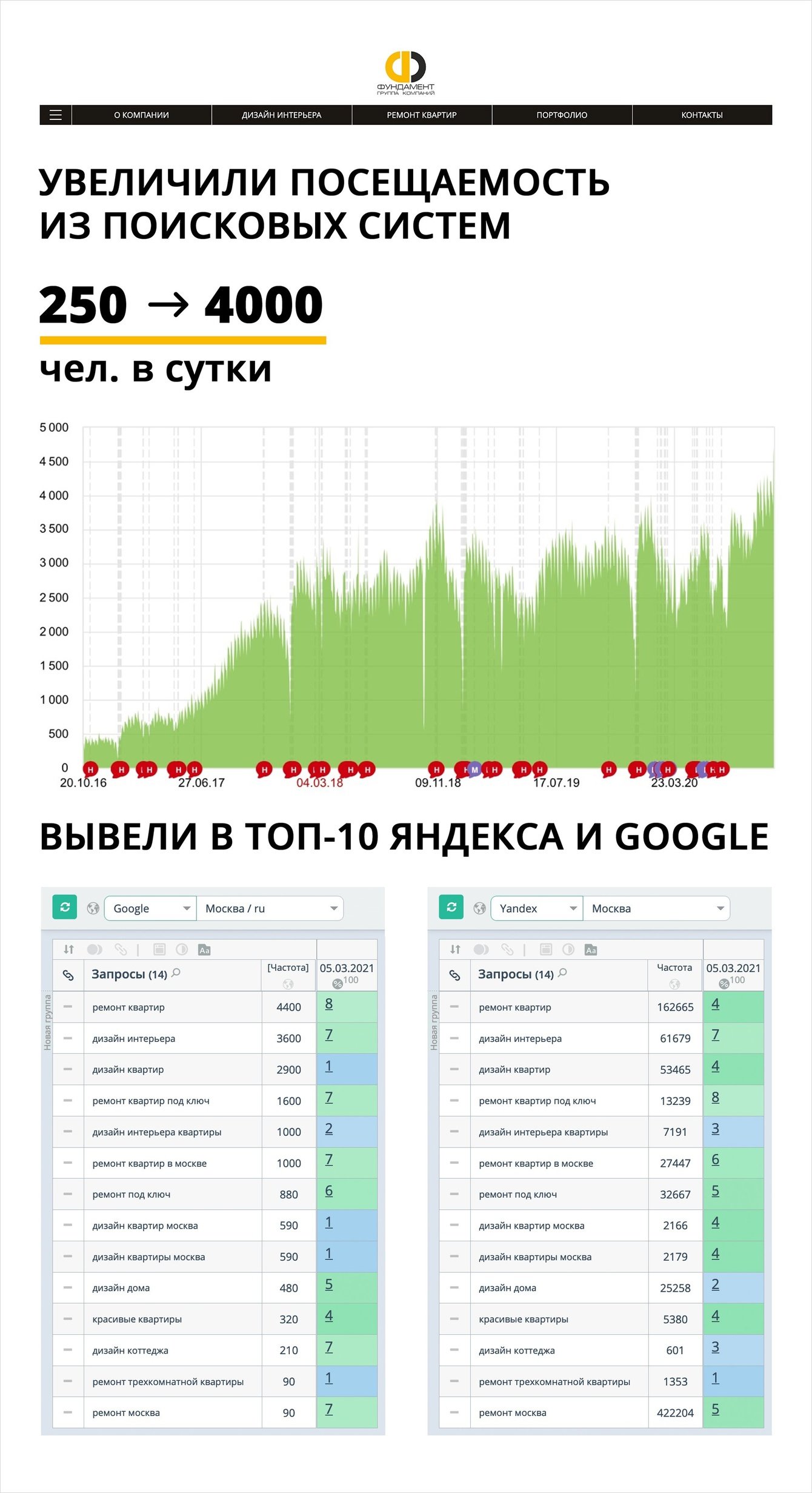 ГК «Фундамент» — один из лидеров московского рынка дизайнерского ремонта. Наше успешное сотрудничество по SEO-оптимизации и комплексному продвижению сайта Remont-F.ru позволило «Фундамент» выйти на лидирующие позиции в тематиках «Дизайн интерьера» и «Ремонт квартир».