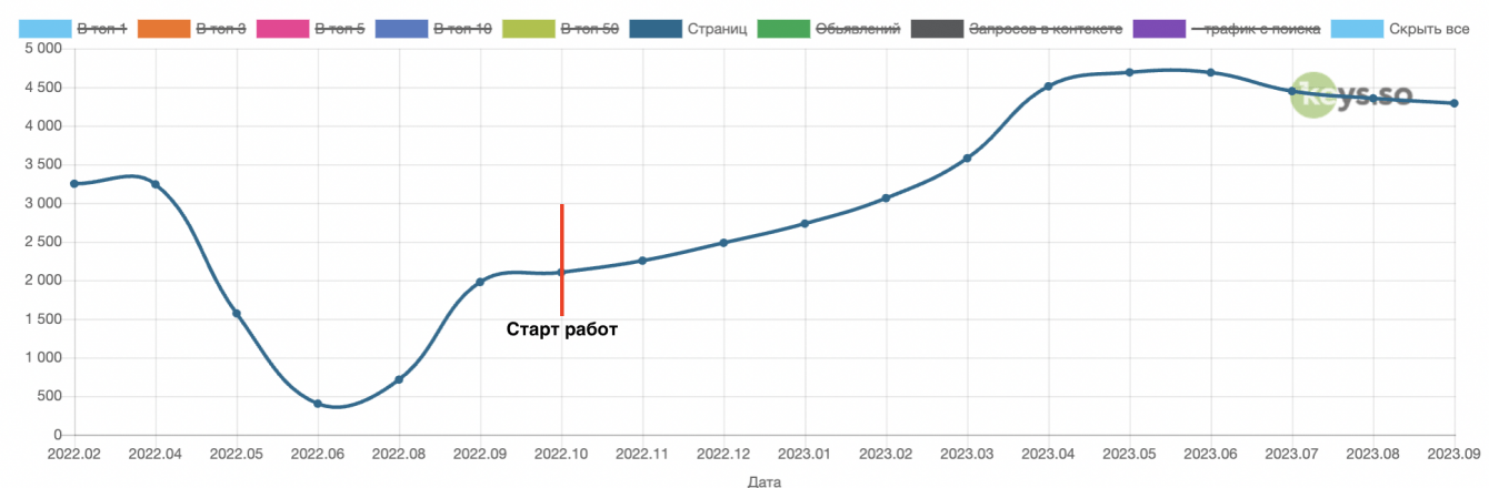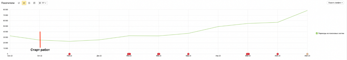 Когда начинали работу, в октябре трафик из поисковых систем был - 24 961 посетитель. В конце июля - 78 085.