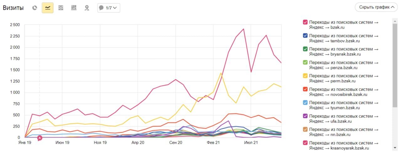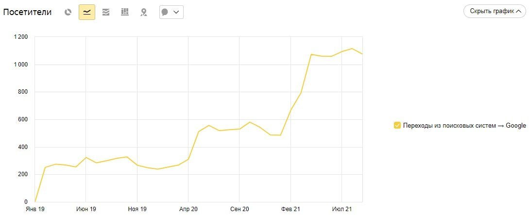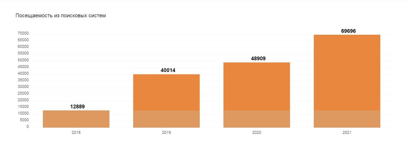 В 2021 году мы воплощали в жизнь нашу стратегию постраничной оптимизации сайта, сосредоточив усилия на продвижении в поисковой системе Google. Результаты наших работ видны на графике.