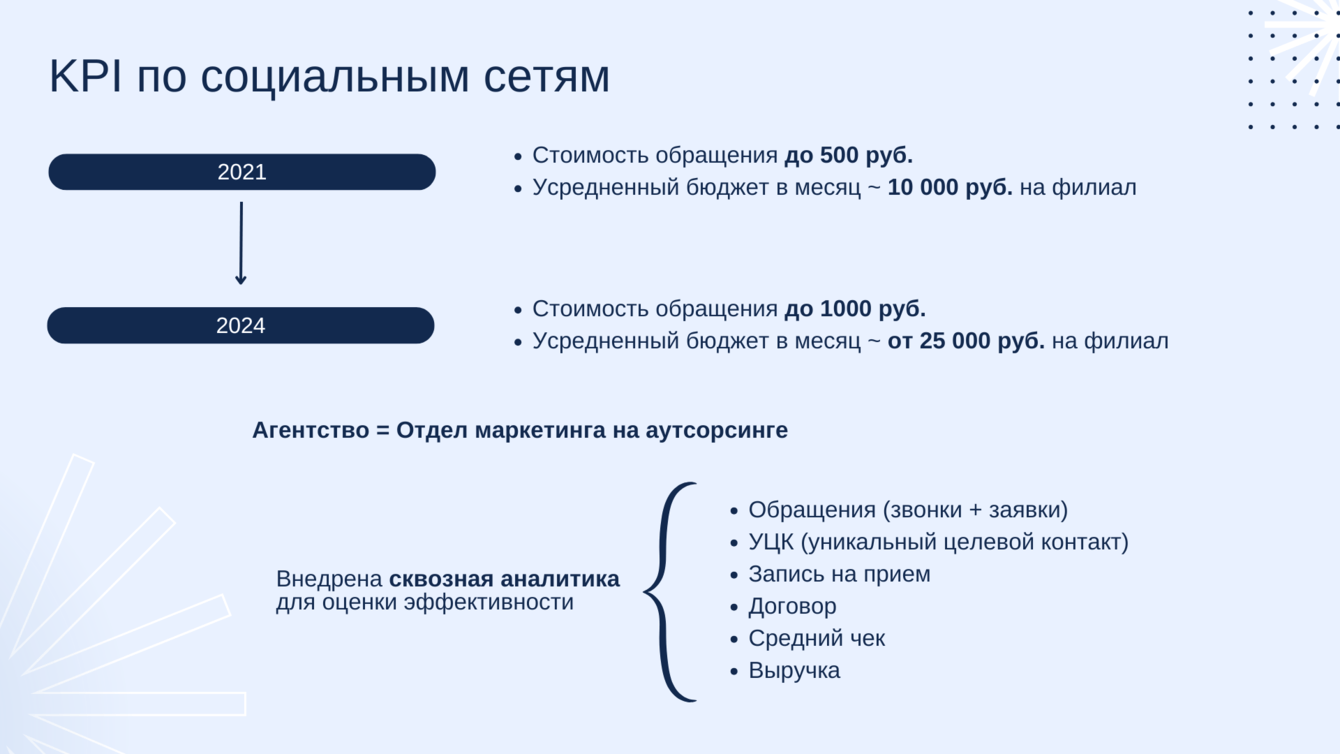 ФОРМАТ РАБОТЫ АГЕНТСТВА: в клинике нет службы маркетинга in-house, поэтому агентство работает в формате оказания полного комплекса маркетинга на аутсорсинге. Клиент обратился в декабре 2020 года. Все работы стартовали в 2021 году и ведутся по настоящее время.