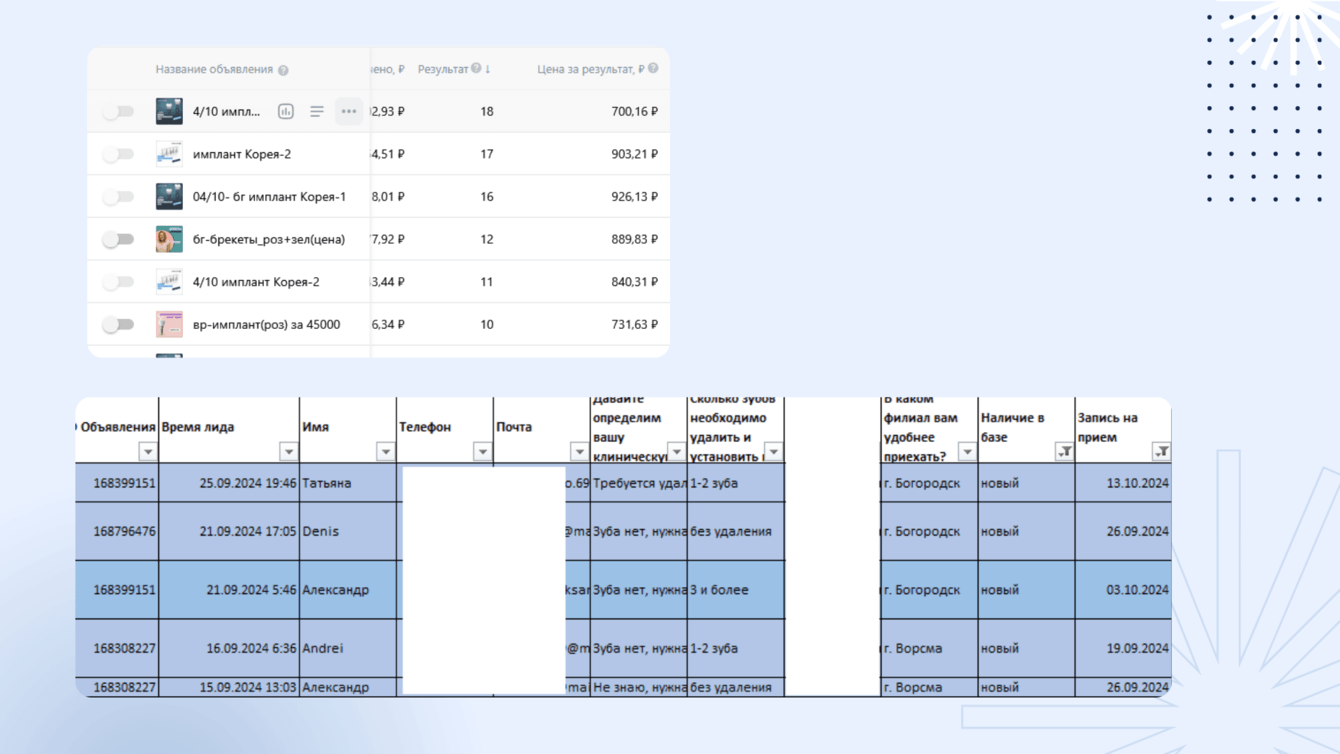 Филиалы клиники имеют разные бюджеты и плановые бизнес-показатели. Поэтому для каждого задан свой уникальный номер телефона и utm-метки. И мы четко знаем как отработала та или иная кампания по всем этапам воронки: от обращения до выручки.