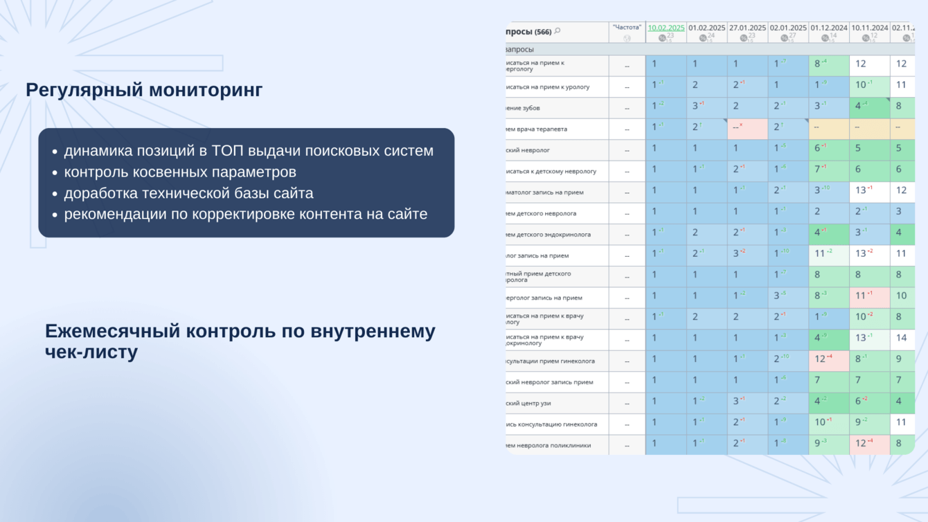 • постоянно и детально вели мониторинг результатов работы. Снимали динамику позиций в ТОП выдачи поисковых систем, отслеживали все косвенные параметры, перепроверяли и дорабатывали техническую базу сайта, параллельно выдавая рекомендации Заказчику по корректировке контента на сайте.