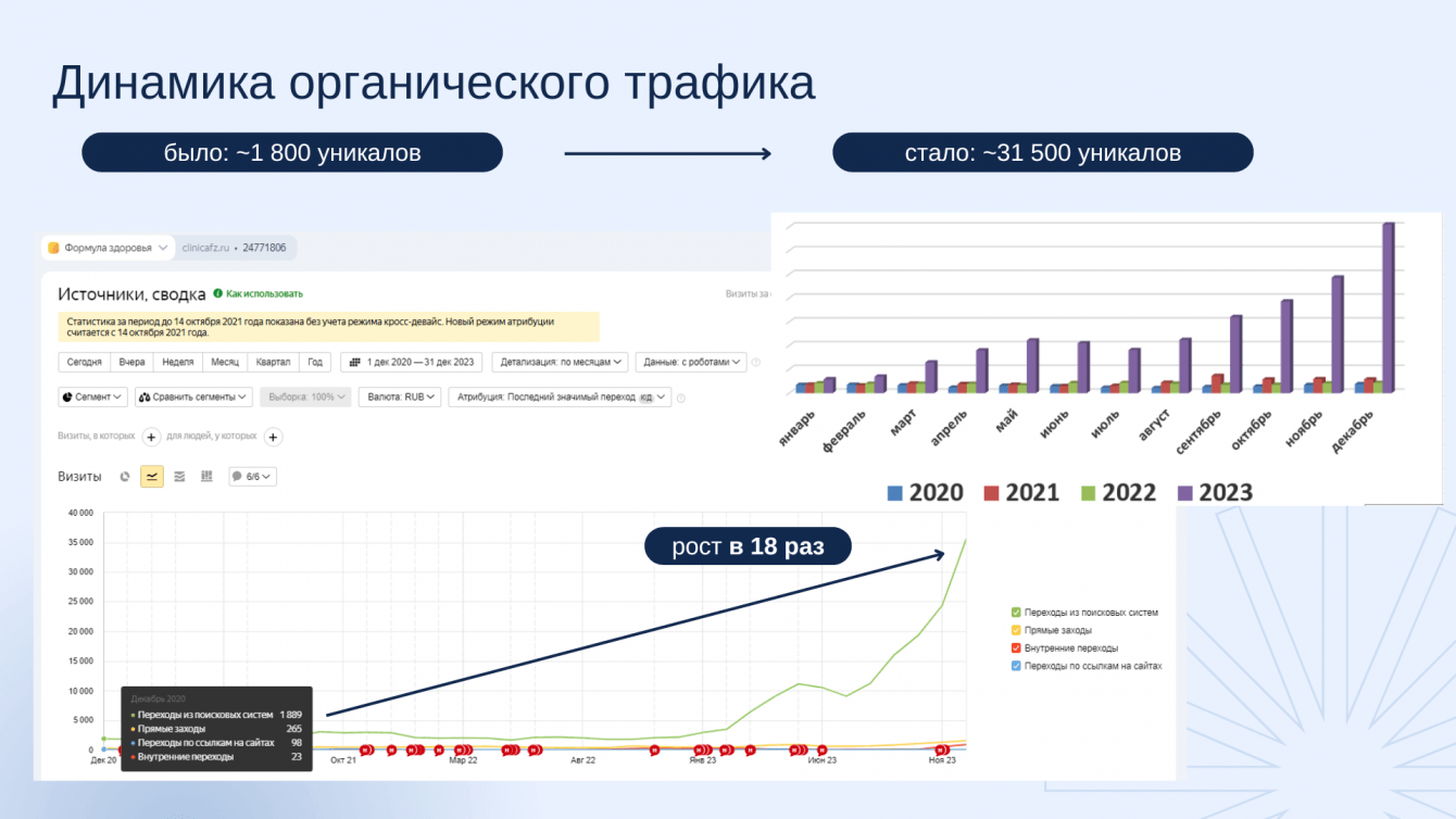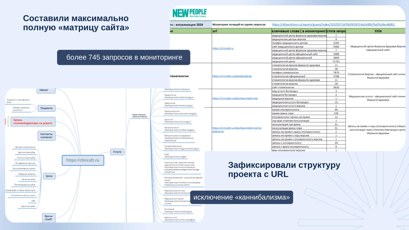 Также, выполнялись некоторые особенные аналитические работы, которые не можем привести в настоящем кейсе так как они составляют коммерческую тайну нашей компании, при работе с сайтами медицинской тематики.