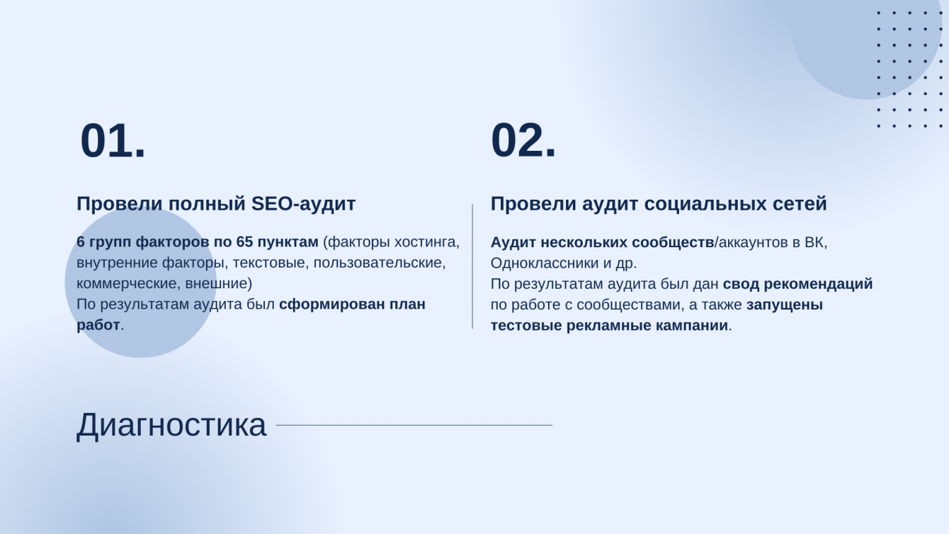 2. Провели аудит социальных сетей (ВК, Одноклассники и др.): контентное наполнение, целевая аудитория, рекламные объявления. По результатам аудита был дан свод рекомендаций по работе с сообществами, а также запущены тестовые РК.