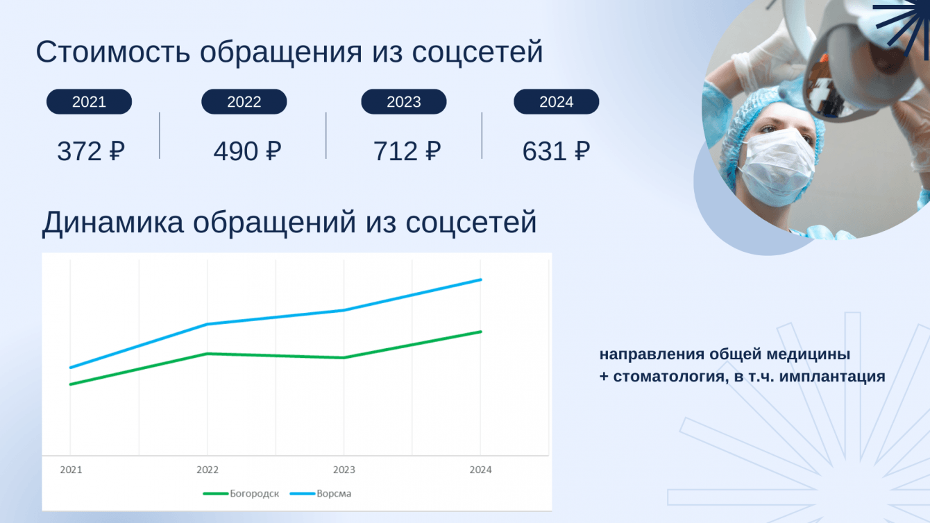 За 4 года работы в данном проекте социальные сети стали одним из ключевых каналов продвижения, который стабильно приносит лиды как по стоматологии, так и по направлениям общей медицины. А в 2024 году – это основной канал обращений по высокомаржинальным услугам – имплантация, ортодонтия, протезирование.