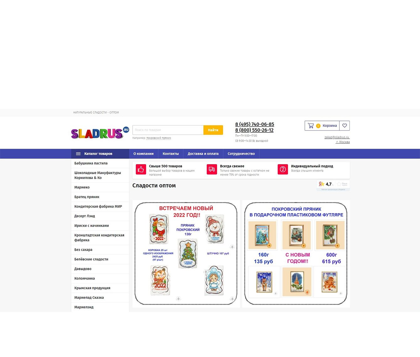 Клиент — оптово-розничный интернет-магазин сладостей российского производства (конфеты, мармелад, пастила, зефир). Прямые контракты с заводами, но продажи только в Москве и области. Сайт существовал с 2014 года, но заказов не приносил.
