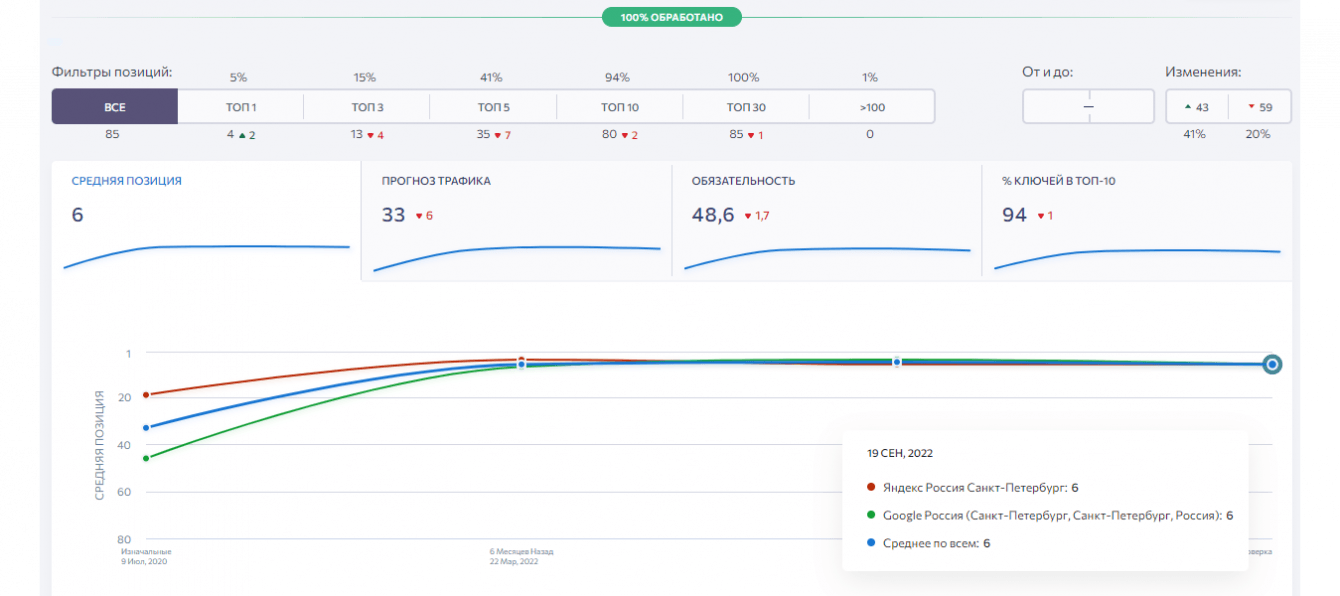 По более чем 94% ключевых запросов веб-ресурс закрепился в топ-10 выдачи.