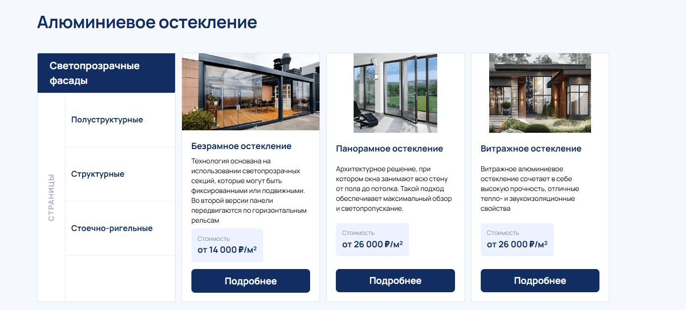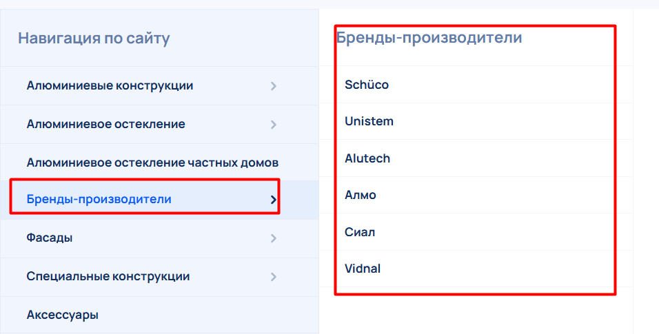 Добавили переходы на страницы Vidnal, Сиал, Alutech, Schüco и других производителей. Это дало рост в Яндексе и Google.