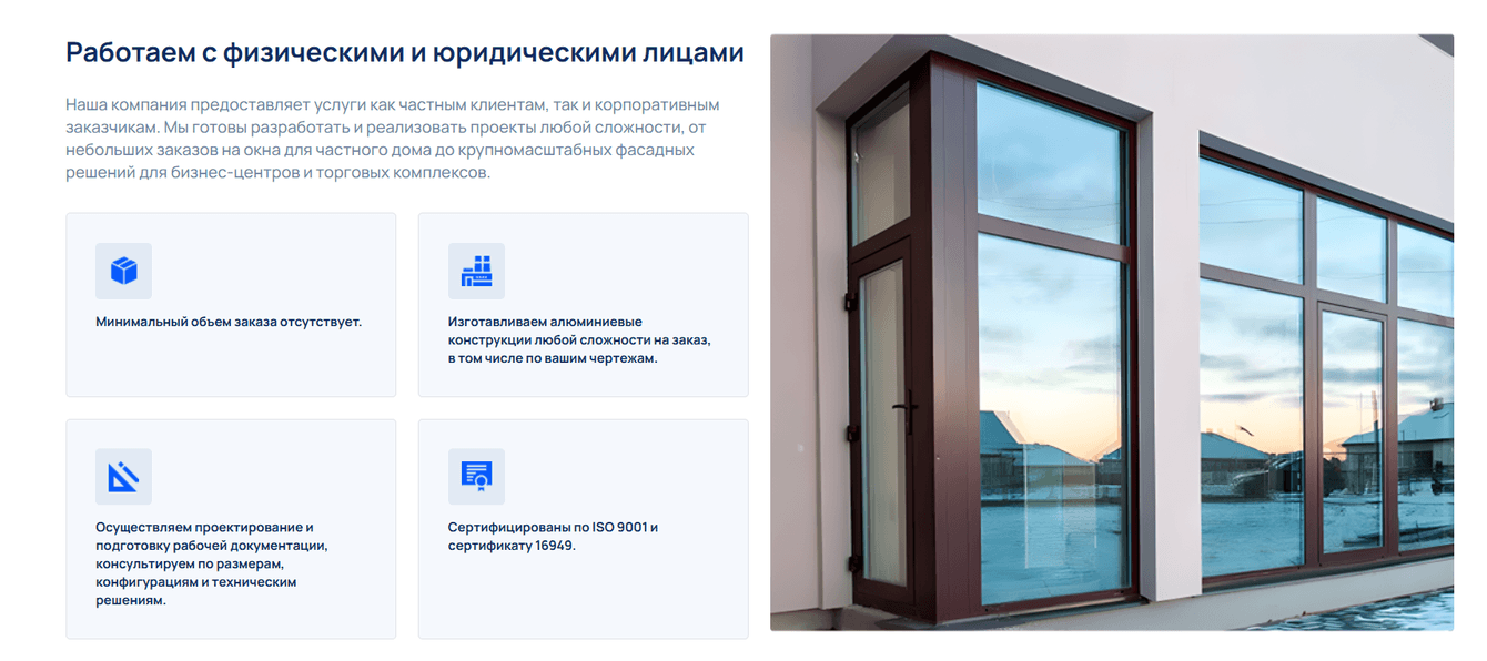 ALUMINSTAR — производитель и подрядчик по монтажу алюминиевых окон, дверей и фасадных конструкций. Компания работает и с частным сектором, и с корпоративными заказчиками: остекление домов и коттеджей, коммерческие объекты, проекты «под ключ» от производства до установки.