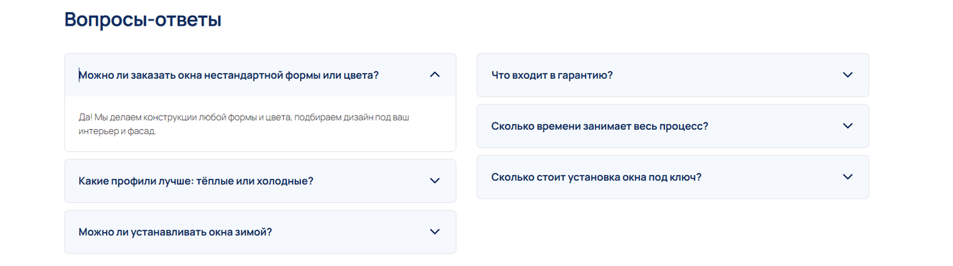 После этого мы пересмотрели подход. Вместо формальных сеошных текстов стали органично вписывать информацию в структуру страниц — в блоки преимуществ, вопросы и ответы, коммерческие элементы. Контент стал вполне себе живым и полезным, поэтому страницы стали сильно расти в поиске.