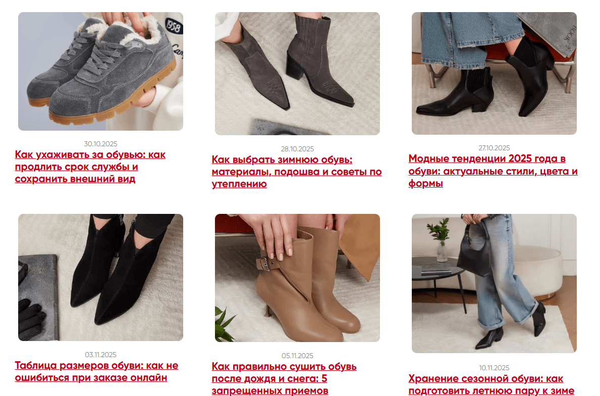 Когда основные этапы по улучшению структуры и семантики сайта были завершены, мы сосредоточились на развитии информационного контента. Блог и статьи на сайте стали важной частью стратегии SEO. Мы активно начали развивать раздел с полезной информацией, который бы привлекал не только покупателей, но и пользователей, которые ищут информацию о товарах, модных трендах, уходе за обувью и других аспектах.