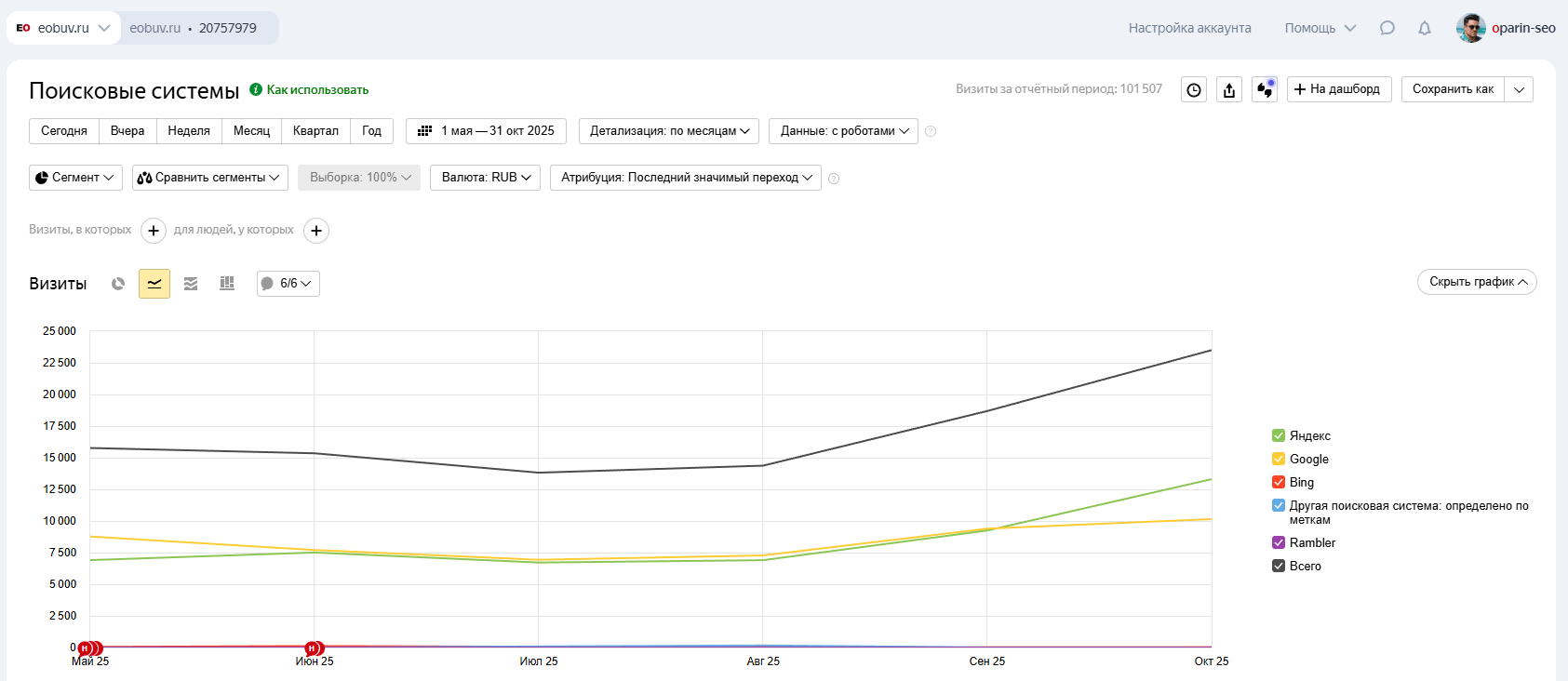 Работа над проектом eobuv.ru продолжает приносить результаты, и важно понимать, что рост трафика и улучшение позиций — это долгосрочный процесс. Хотя мы достигли значительных успехов за три месяца, дальнейшая работа по семантическому анализу и оптимизации контента продолжается. Мы продолжаем добавлять новые страницы, оптимизировать контент и совершенствовать структуру сайта. Этот процесс не заканчивается, и мы продолжаем получать положительные результаты, что подтверждается постоянным ростом трафика и позиций.
