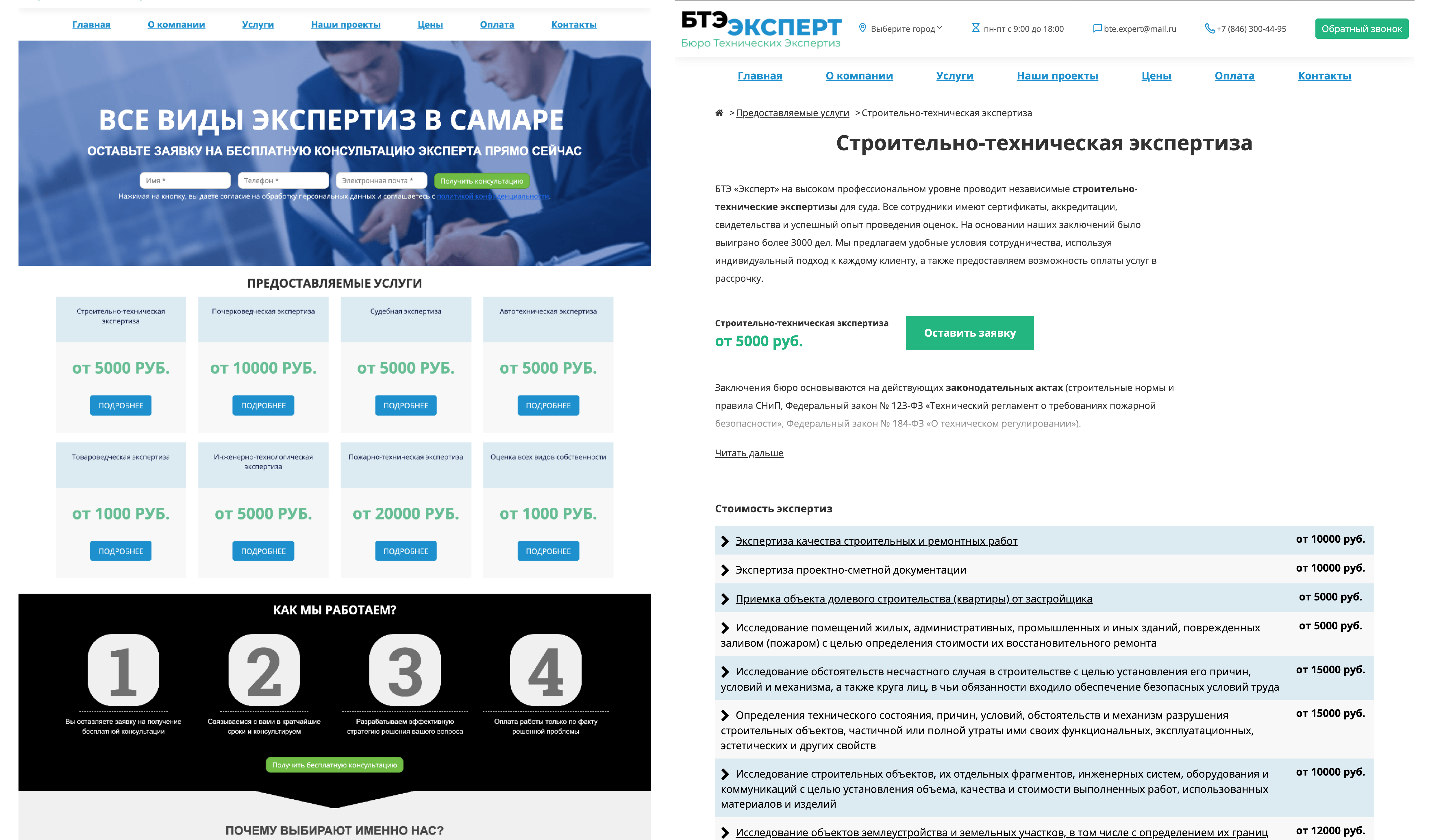 Мы разработали функциональный сайт и сразу заложили архитектуру под SEO: разбили общие услуги на множество конкретных посадочных страниц. Вместо одной общей страницы «Экспертиза» мы сделали десятки узких: «Инженерно-технологическая экспертиза», «Строительно-техническая экспертиза», «Судебная экспертиза» и т.д.