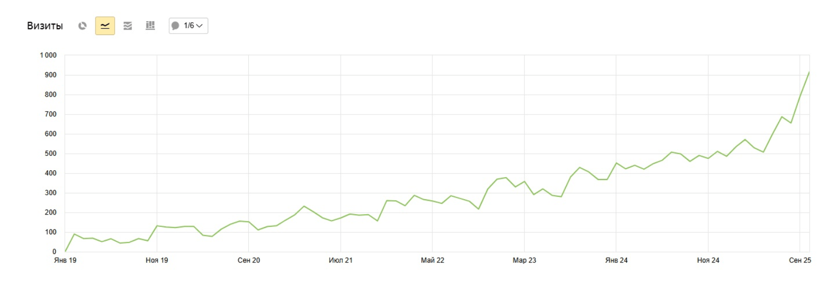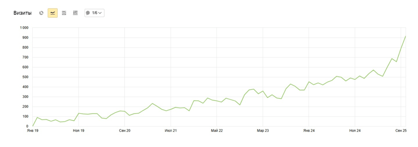 Динамика: График в Яндекс метрике с января 2019 по конец 2025 года показывает стабильный, ускоряющийся рост. Мы начинали с 0, а сейчас получаем около 1000 визитов из поиска ежемесячно.
