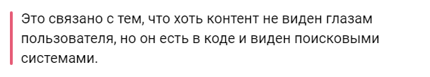 Но в коде видны оба элемента и поисковые системы учитывают их как дубли текста на странице. А если в этом тексте находится много ключевых слов, то за это можно также попасть под фильтр “Переспам” и гадать почему сайт находится в ТОП-50.