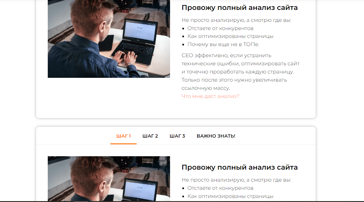 В тематике курсов много продаж идет из блока, если он правильно оформлен и экспертно написан, что очень подкупает аудиторию и повышает доверие к компании.