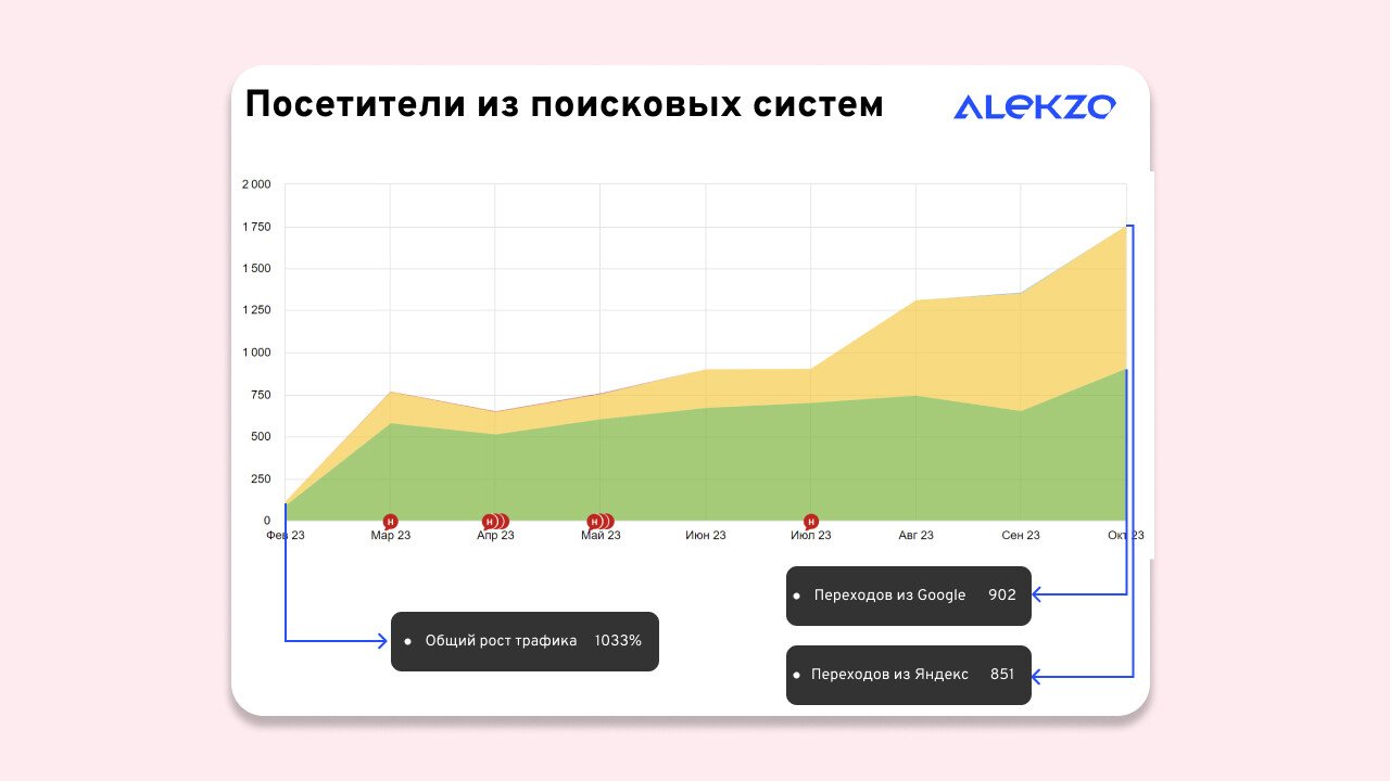 Основным способом увеличения трафика, который мы используем в Alekzo, служит создание нужных страниц под запросы пользователя, которые четко отвечают на его запрос и увеличивают запросный индекс сайта.