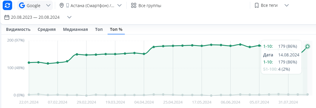 01/ Рост видимости и позиций: Как видно на графике, процент ключевых запросов, попавших в ТОП-10, увеличился до 86%, что свидетельствует о существенном улучшении позиций сайта. Более 97% запросов находятся в первой десятке поисковой выдачи.
