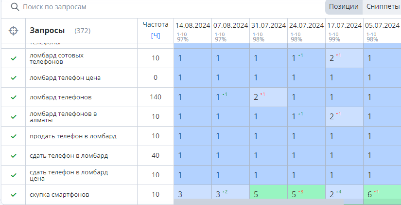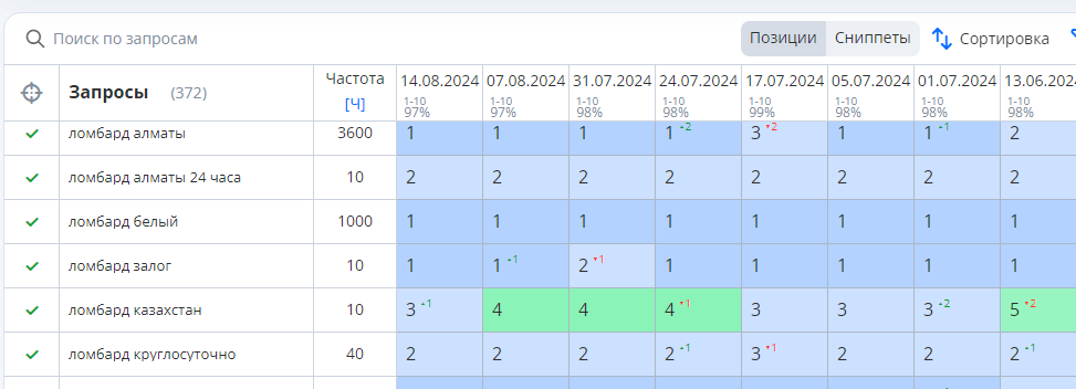 03/ Укрепление позиций по ключевым запросам: В таблице запросов видно, что по многим высокочастотным ключевым фразам, таким как «ломбард алматы», «ломбард алматы 24 часа», «ломбард белый», сайт стабильно занимает лидирующие позиции.
