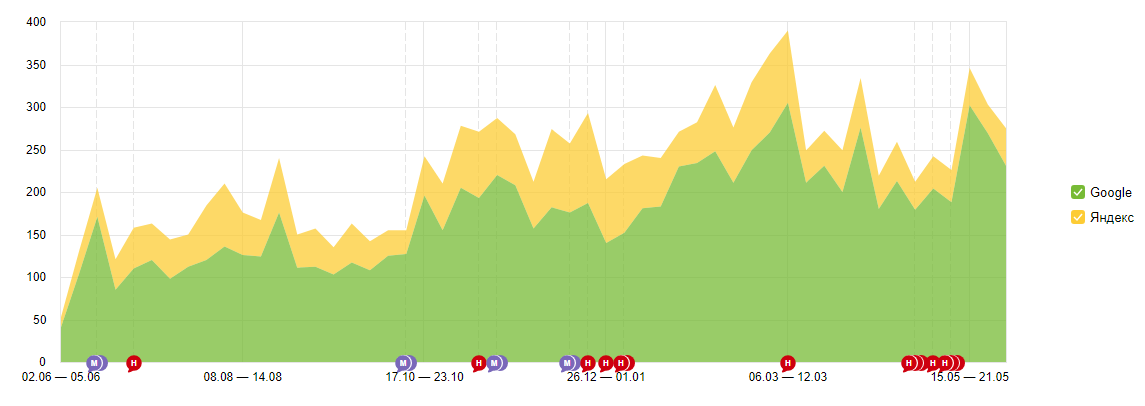 За 12 месяцев работы количество страниц, проиндексированных роботами и отображаемых в выдаче, выросло до 400+ в Яндексе и до 350+ в Google по российской версии сайта, а также до 470+ в Яндекс и 520+ в Google — по by-версии.