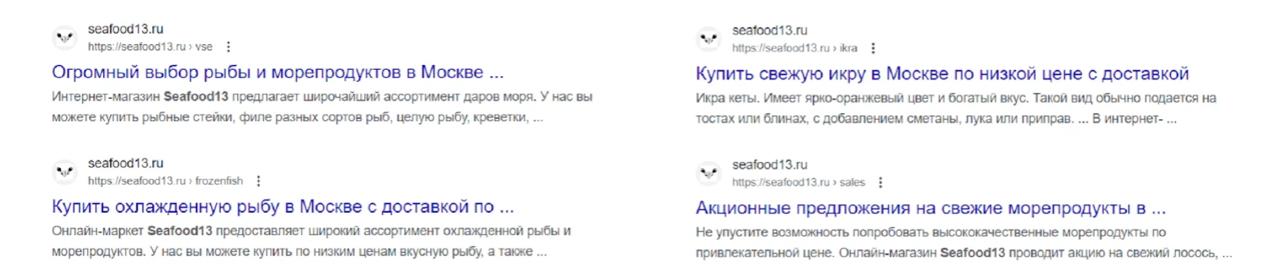 Далее мы написали мета-теги title и description для статичных страниц и внедрили их. Для товаров обычно они пишутся по шаблону, ведь охватить сотни страниц - дело немного нерациональное, но в данном кейсе мы все же это сделали. Товаров на момент написания было более сотни. И эта работа дала плоды.