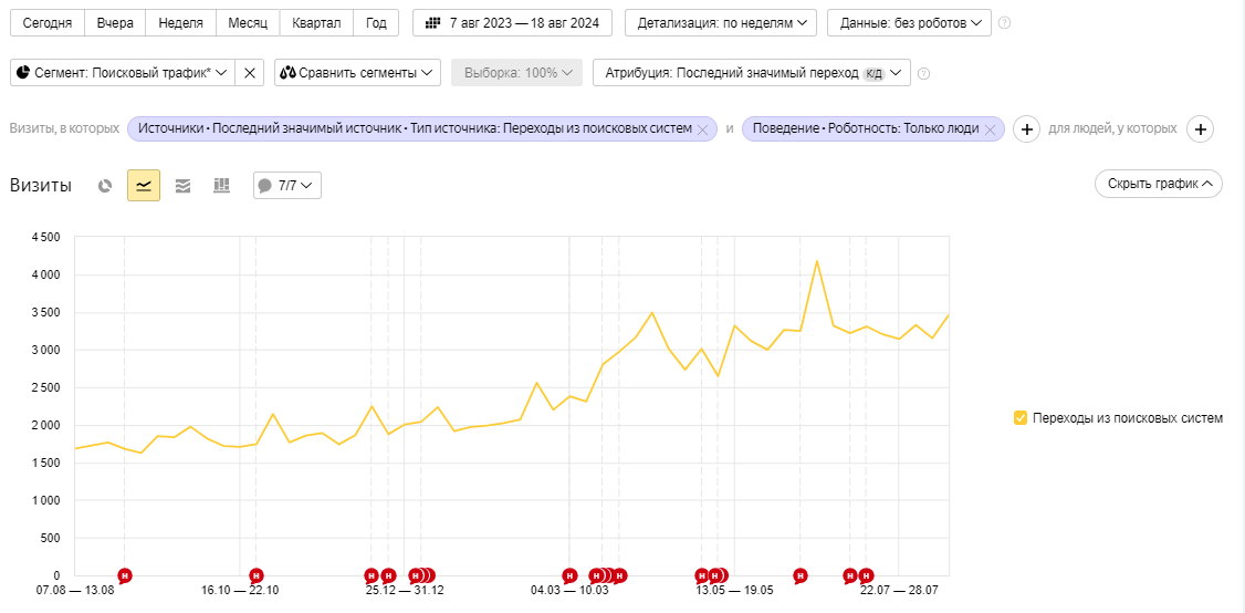 01/ Динамика визитов из поисковых систем (данные Яндекс Метрики) показала стабильный рост на протяжении года. График указывает на увеличение органического трафика с каждым месяцем.