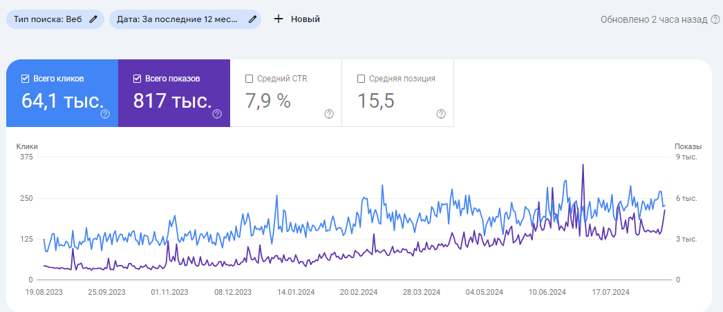 02/ Показы и клики в Google (данные Google Search Console) также демонстрируют положительную тенденцию. Количество показов достигло 817 тысяч, кликов — 64,1 тысячи, средний CTR составил 7,9%, что является хорошим показателем для данной ниши.