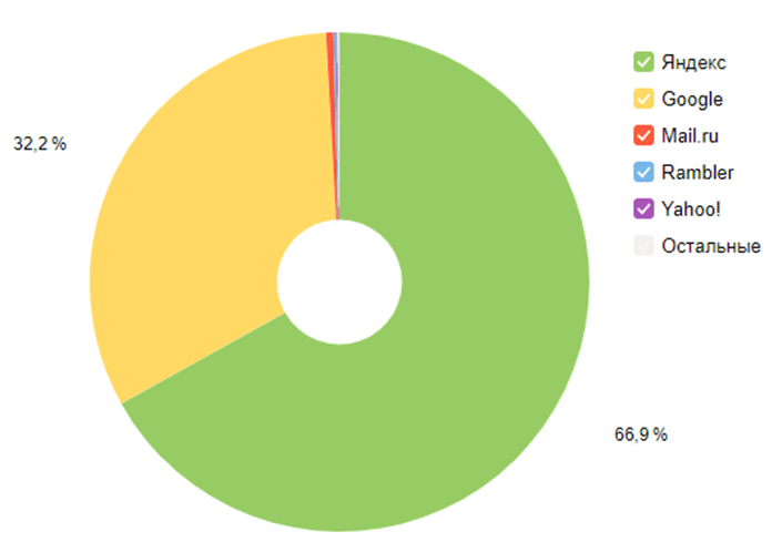 Поиск Google и Яндекс имеют примерно равные доли пользователей в России, и такая пропорция их трафика на сайт означает, что в силу каких-то причин интернет-магазин недополучает большое число заходов с Google.