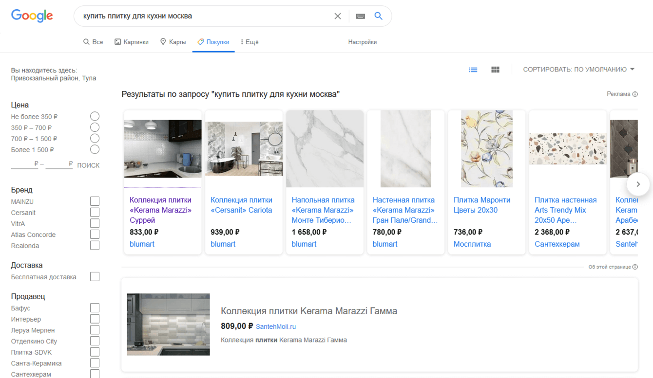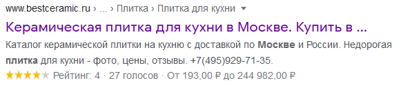 По данным из Консоли для вебмастеров Google, на ресурсе https://mosplitka.ru/ было более 5 тысяч страниц с ошибками в микроразметке. Из-за неверной разметки представление страниц разделов каталога, карточек товара проигрывало конкурентам в поисковой выдаче.Пример сниппета в Google страницы каталога анализируемого сайта и конкурента:Как видно страница каталога конкурента в сниппете содержит рейтинг, цену.