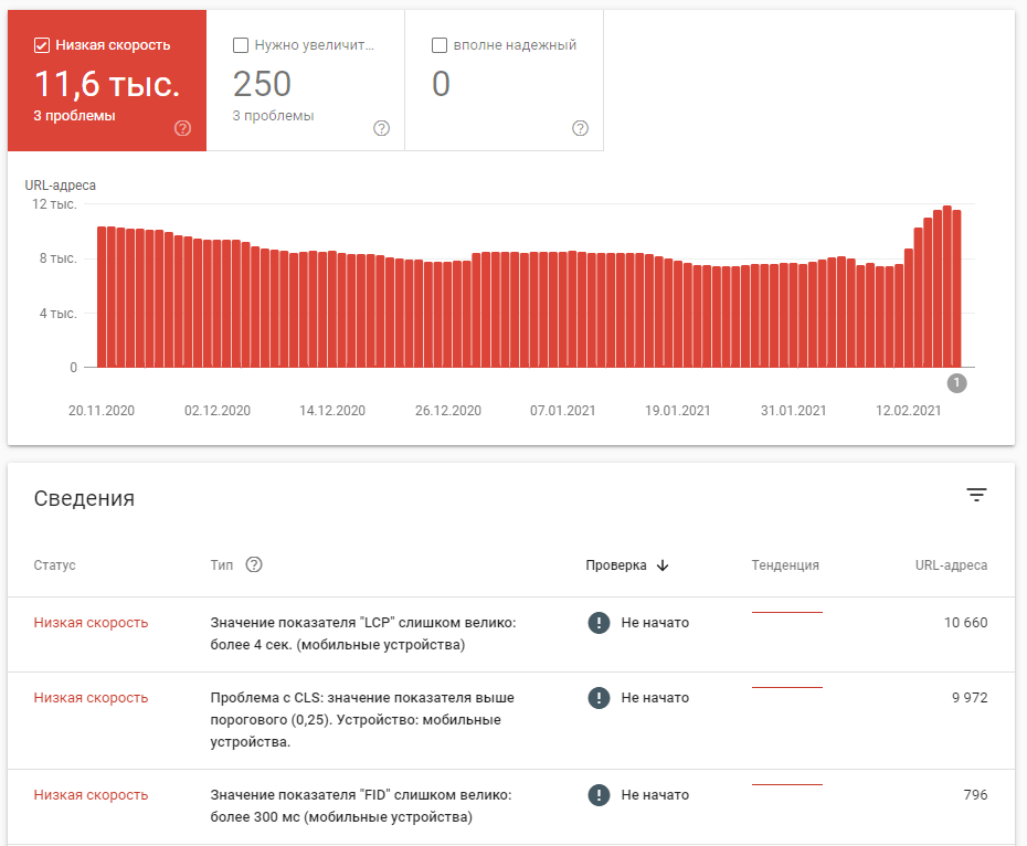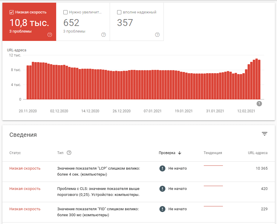Скорость загрузки страниц сайтаПо данным Google, у различных страниц сайта наблюдались проблемы со скоростью загрузки. В Консоли для вебмастеров (отчет «Основные интернет-показатели») можно посмотреть реальные данные по скорости загрузки страниц ресурса, которыми располагает Google.Согласно данным сервиса, скорость загрузки большей части страниц на мобильных устройствах низкая (при этом число проблемных страниц росло):Аналогичные показатели скорости загрузки страниц получены для стационарных компьютеров:Как видно на скриншотах выше, Google отдельно выделяет проблемы с параметрами LCP, CLS, FID - это важнейшие показатели, которые входят в метрику Core Web Vitals.