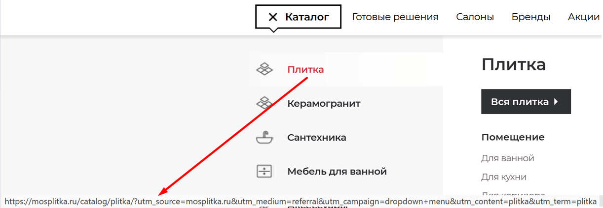 Почти все ссылки на разделы и подразделы каталога сайта в верхнем горизонтальном меню содержали UTM метки.