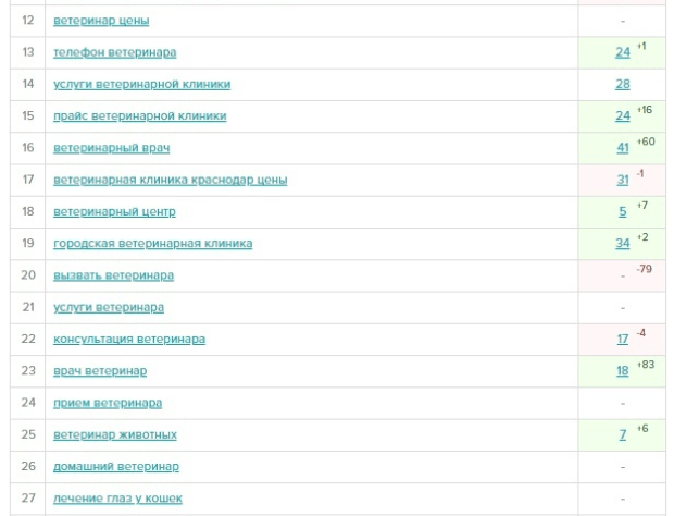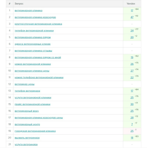 Показаны нынешние позиции по ключам в Яндексе по ГЕО: Краснодар (зеленый цвет - это насколько позиций ключи выросли после последней проверки):