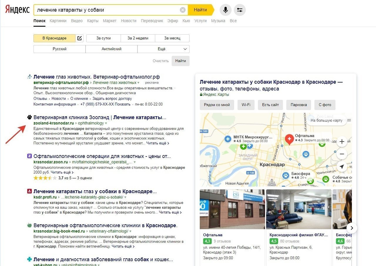 В процессе продвижения еще один ключевик "лечение катаракты у собаки" попал в ТОП-2 по поиску в Краснодаре через Яндекс.