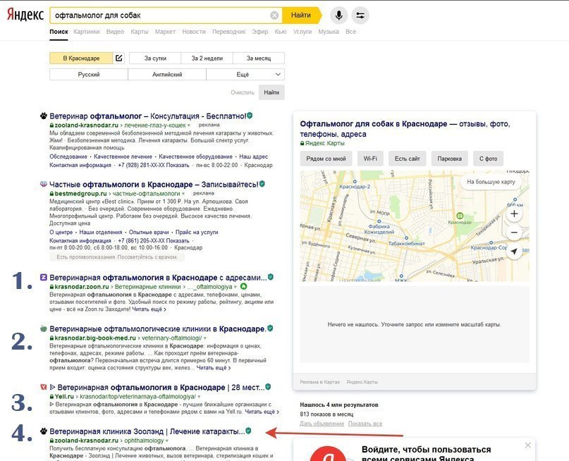 Вышли в ТОП-4 запроса - офтальмолог для собак.