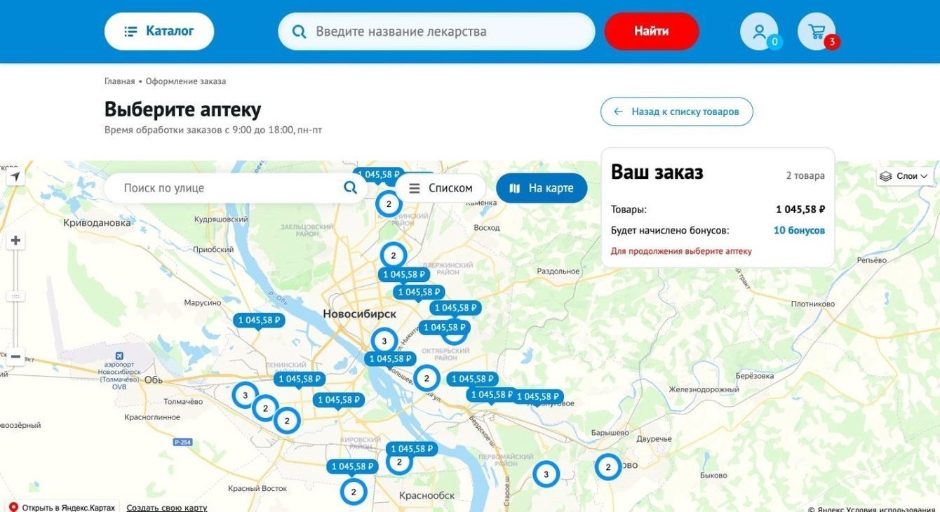 Чтобы пользователю было удобнее ориентироваться в пунктах самовывоза, мы оформили адреса аптек в виде списка и карты.