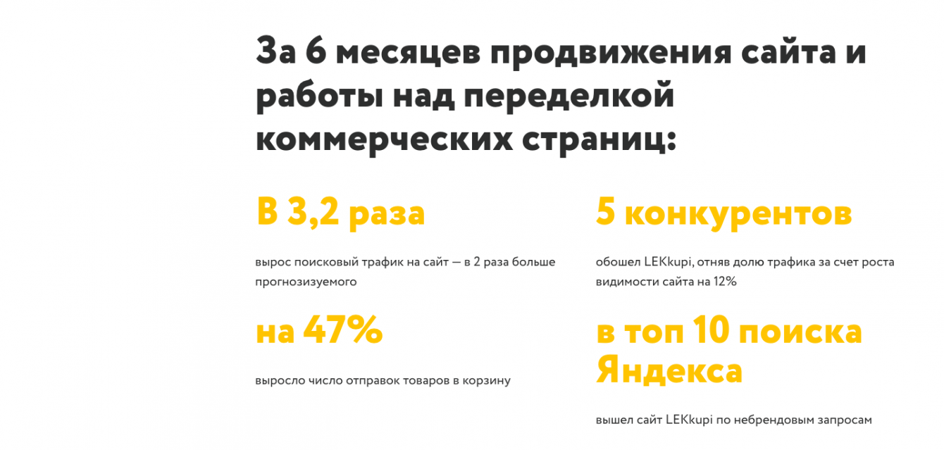Исследовав все симптомы, мы поставили сайту LEKkupi диагноз — слабое usability. Чтобы продвинуть компанию в ТОП поиска, необходимо было действовать по рецепту от наших SEO-специалистов: