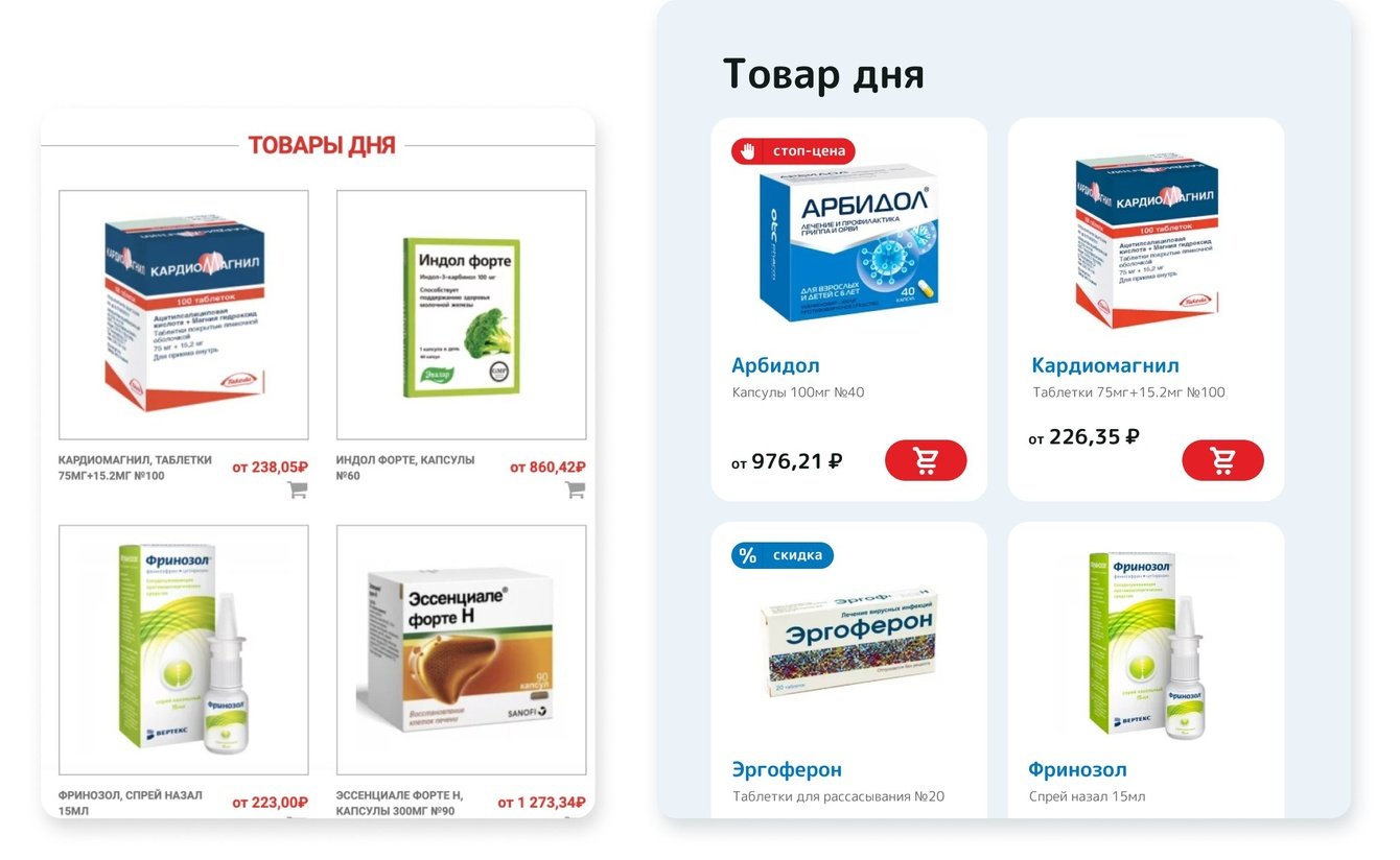 В товарах дня изменили цвет поля цены, сместив фокус на корзину. Чтобы пользователю было сразу понятно, что это не сайт-витрина или площадка для сравнения цен, а интернет-магазин.