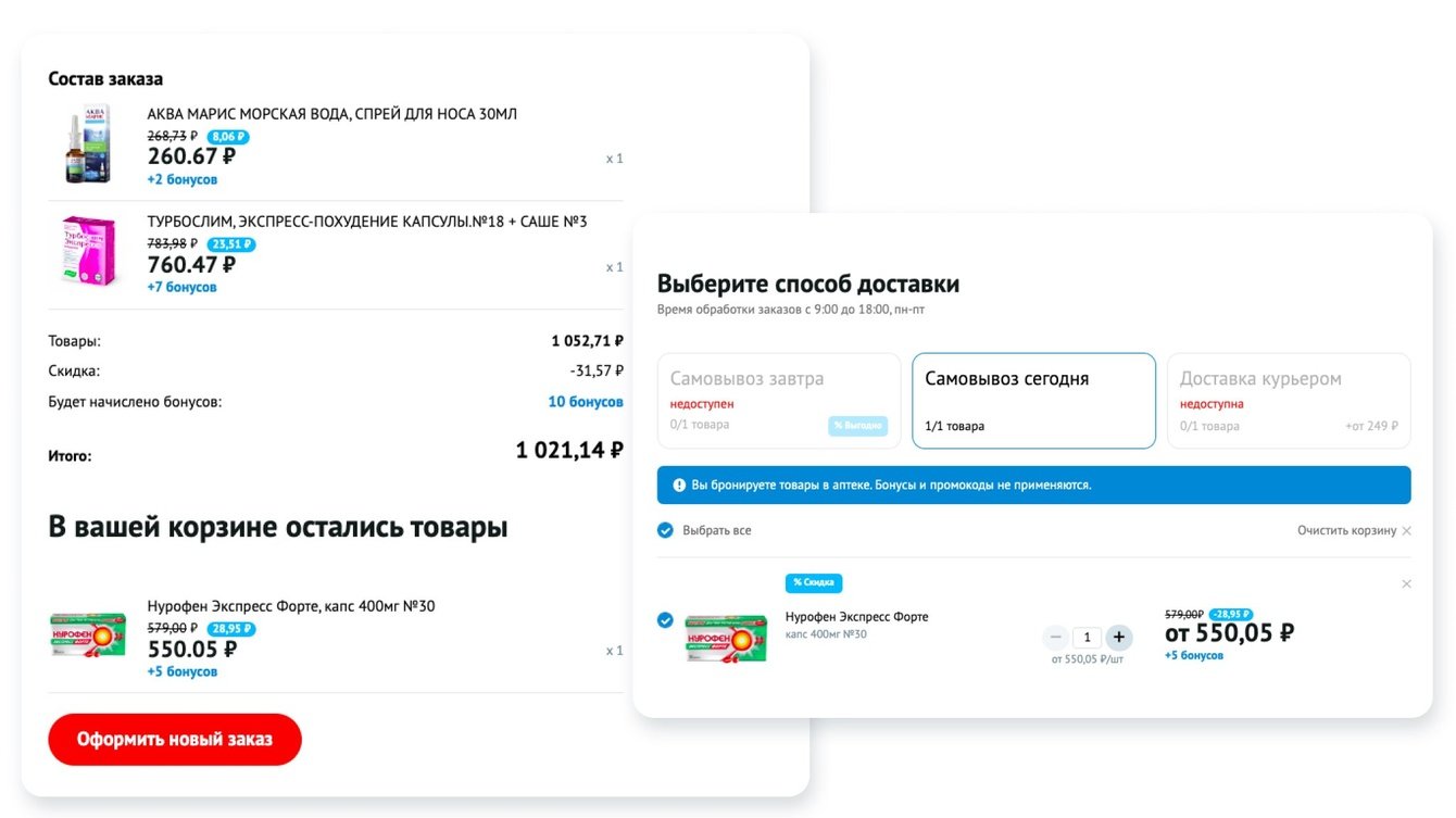 Мы спроектировали отдельный функционал для ситуации, когда нельзя забрать все товары вместе. Отсутствующие позиции не выбрасываются из корзины, а предлагаются для оформления на другое число или другим способом доставки. Пользователю не нужно формировать корзину по новой — достаточно кликнуть по кнопке "Оформить новый заказ" и перейти к оформлению.