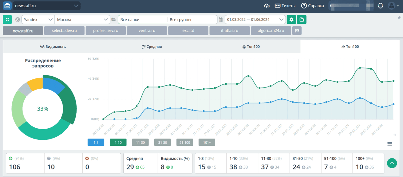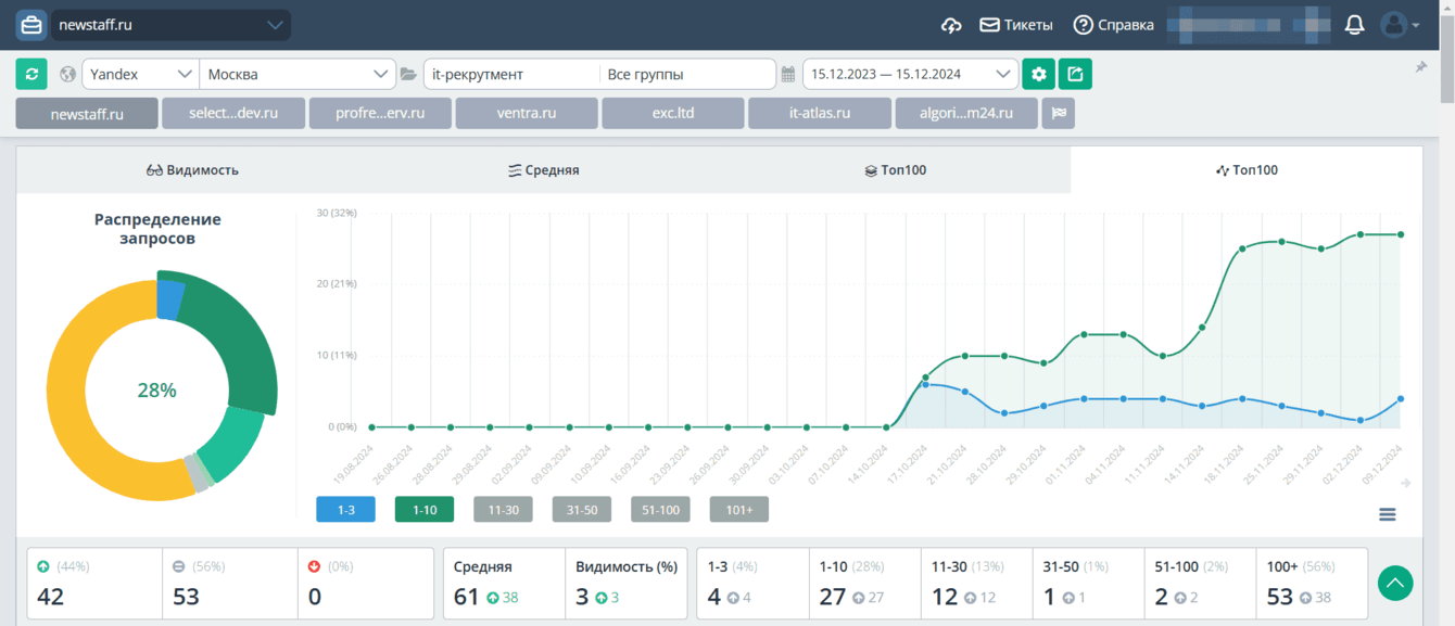 Финальные цифры говорят сами за себя: с абсолютного нуля до половины запросов в топе за 12 месяцев. Newstaff получила мощнейший канал лидогенерации и заняла лидирующие позиции в своей нише.