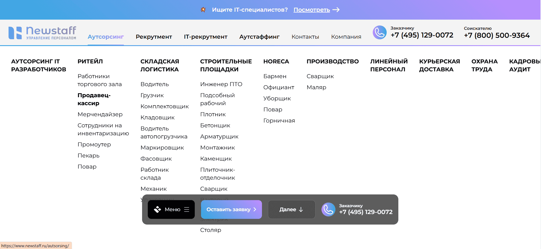 Здесь началась по-настоящему кропотливая работа. Создавались детальные страницы под каждое направление аутсорсинга: от популярных специальностей вроде продавцов-консультантов до экзотических ниш типа аутсорсинга монтажников.